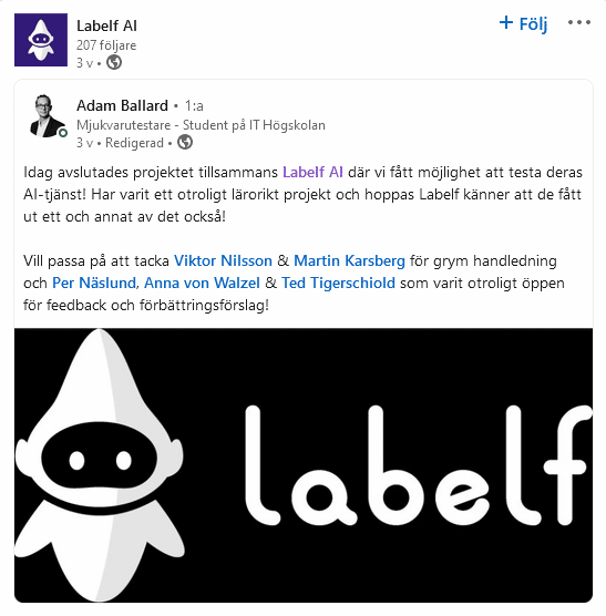 Vad gjorde ni med resultatet? Resultatet var värdefullt för vår fortsatta utveckling av produkten och IT-Högskolans studerande har verkligen skapat ett stort värde får oss och det kommande arbetet med Labelf.ai. De studerande har verkligen engagerat sig i uppgiften och levererat att gott resultat, de studerande upptäckte vissa buggar som kunde fixas och ta produkten till nästa nivå. Främst fick vi bra feedback inom UX/UI som hjälpt oss i kommande utveckling av applikationen.