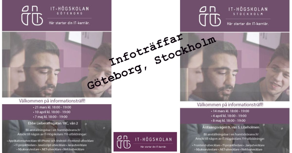 Är du nyfiken på någon av IT-Högskolans utbildningar och vill veta mer? Välkommen på någon av vårens infoträffar på IT-Högskolan. Först ut är Stockholm 14 mars och Göteborg 21 mars. Välkomna!